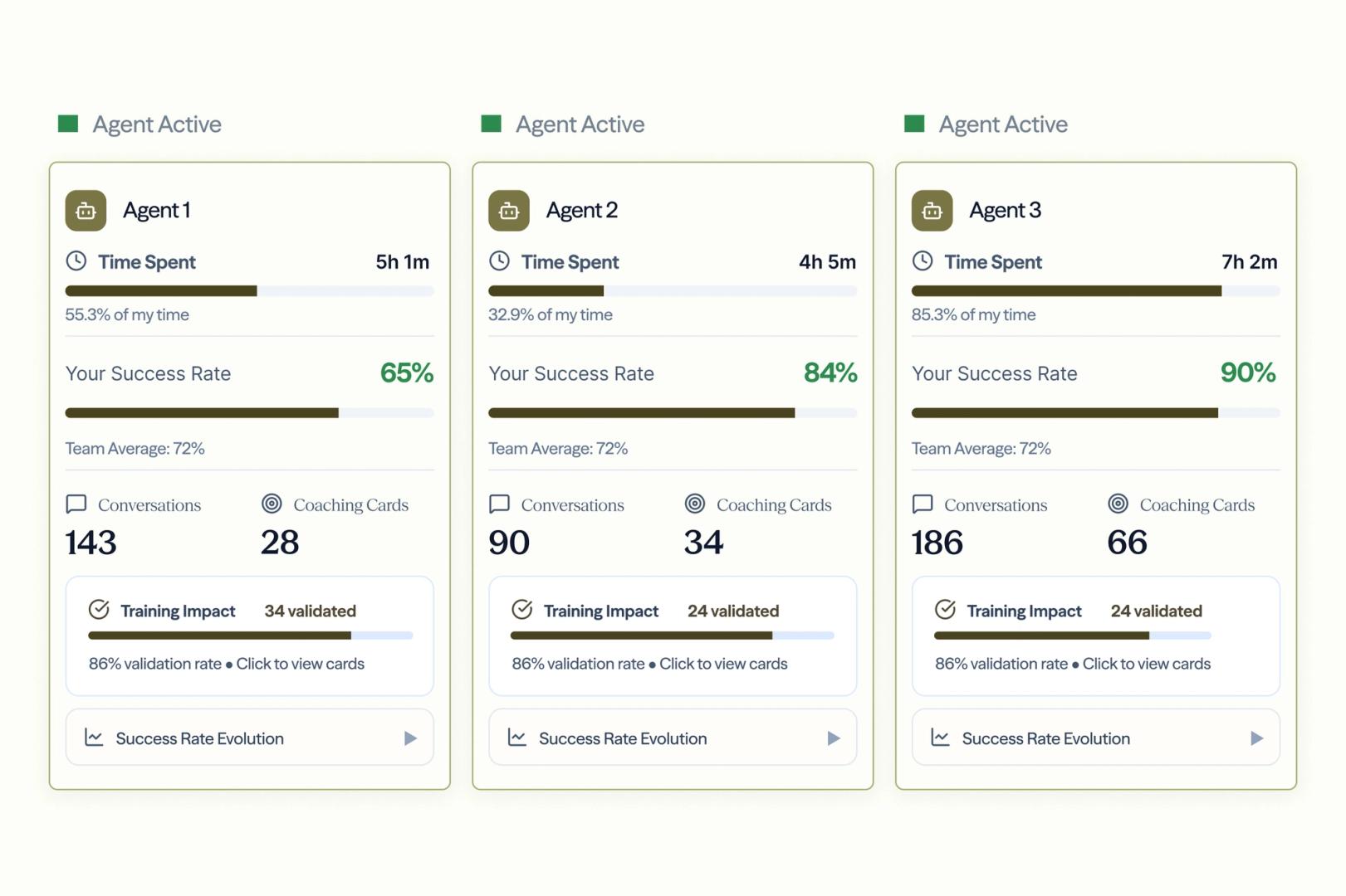 Agents learn incrementally based on A/B testing, human feedback, and scientific quantitative metrics extracted from each conversation. We cover all contexts, from goal achievement to customer sentiment and intent trajectory.